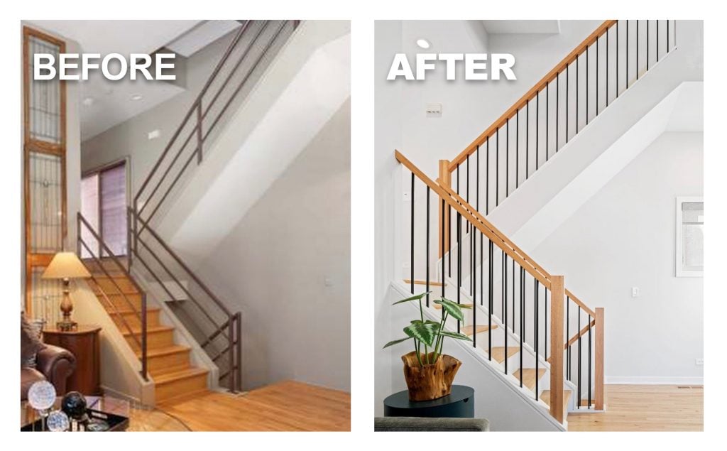 Utilizing clear coated red oak, the light warmth of the wood pops against the cool white of the house. The black round baluster is seamlessly integrated into the knee wall and handrail without the use of cosmetic shoes.