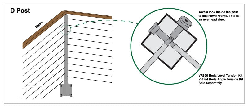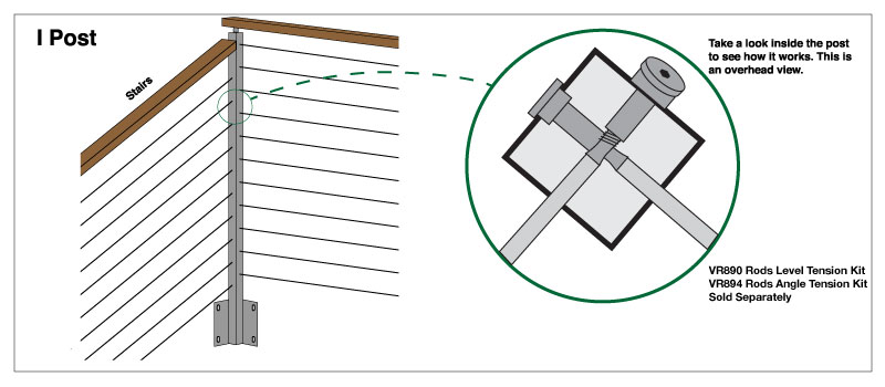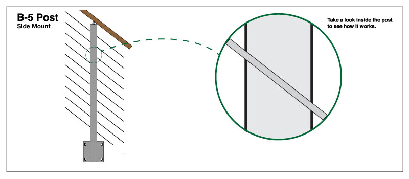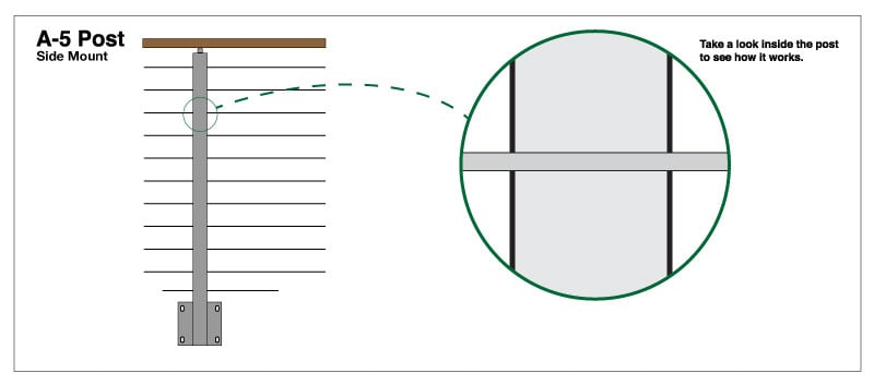 “A-5” – The “A-5″ post is designed to be an intermediate post on level runs. It has level holes drilled on both sides of the post. The rods will simply pass directly through the post, no additional fittings are required.