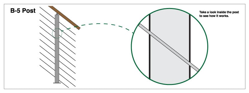 “A-5” – The “A-5″ post is designed to be an intermediate post on level runs. It has level holes drilled on both sides of the post. The rods will simply pass directly through the post, no additional fittings are required.